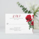 Red rosebuds reply card. White cards with black, printed text have simple and traditional RSVP wording. Real red rose stems with greenery decorate the righthand edge of the cards. Include a line for guests to give a count to get an exact guest number. Or change the wording to your preference. Reverse is solid red colour.