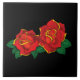 Two red roses in a backdrop of black all drawn in a traditional tattoo style.