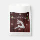 Add a dash of woodland charm to your celebration with this festive holiday Red Rustic Christmas Reindeer Party Favour Bag, featuring a leaping jumping reindeer surrounded by white snowflakes and falling snow over a cosy rustic wood background. The cheerful Merry Christmas message is displayed in bold festive typography, perfectly tying together your rustic reindeer party theme.