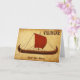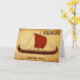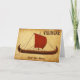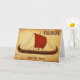 A Viking long ship with a red sail seen in profile from the right side and superimposed on an old paper background image. "Carved wooden" text reading, "VIKINGAR" (Old Norse - VIKINGS) also appears. Customise by adding your own additional text.