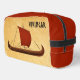 A Viking long ship with a red sail seen in profile from the right side. It is superimposed on an old paper background image and text reading "VIKINGAR" (Vikings), also appears. Customise by adding your own additional text.