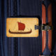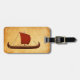 A Viking long ship with a red sail seen in profile from the right side and superimposed on an old paper background image. Customise by adding your own name and address. You may change both the text font and colour.