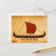A Viking long ship with a red sail seen in profile from the right side and superimposed on an old paper background image. Customise by adding your own text.