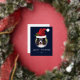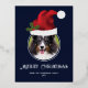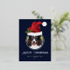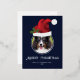 Personalizable Christmas photo template design where a red Santa hat illustration by Destei is placed above a round photo. The Santa hat has a green Christmas Holly plant on it and the background colour is dark blue. Under the image there are two personalizable text areas that are placed in the foil design area.