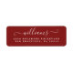 Red script last name return address label featuring elegant handwritten typography paired with clean, modern address text. Designed for everyday personal mail, holiday cards, thank you notes, and family correspondence, this label offers a timeless and stylish way to personalize envelopes. The rich red background and flowing script create a warm, classic look suitable for year-round use.