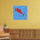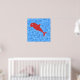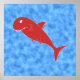 A red colour shark cartoon on a blue patterned background. The shark and blue pattern are a printed design, it is not a raised or textured design.