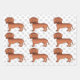 Destei's original cartoon illustration of a cute smooth coat red coat colour Dachshund breed dog. The dog design is placed nine times on each sheet. The background has a pattern of grey dog paw prints.