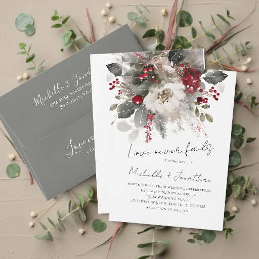 Christian wedding invitation depicts an elegant Christmas, winter floral watercolor with white flowers, red berries, silver holly leaves and pine. It features inspirational quote introduction from Bible Verse 1 Corinthians 13:8, "Lover never fails." The back features a portion of verses 1 Corinthians 13 7-8, "LOVE… hopes all things, endures all things, Love never fails." This side can be framed for a special keepsake. If there is something you don't see or if you would like changes, please contact me with the chat button on the Zazzle page.