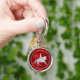This distinctive personalised key chain features an English style equestrian in silver grey at the centre, surrounded by a faux silver double circle frame. The frame and the monogram are placed on a red gradient background that seems to almost glow, and your three letter monogram at the side. Elegant!
