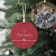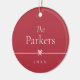 Sweet and simple Christmas ornament features a minimalist layout, with your family name and the year in clean, classic serif typeface on a festive red background. A petite bow through the centre completes the design. Add a photo to the reverse side.