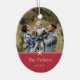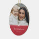 Sweet and simple oval-shaped Christmas photo ornament features a minimalist layout, with your family name and the year in clean, classic serif typeface on a festive red background. A petite bow beneath your photo completes the design.