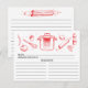 Rustic hand sketched kitchen tools recipe card featuring a rolling pin, pot, pepper mill & whisk with scattered vegetables in red. Flip the recipe card over for space for directions.