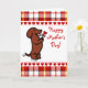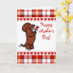 Unique and funny Dog Art painted by Naomi Ochiai from Japan. Cute and Funny Dachshund cartoon gift items for Dachshund fans!! An adorable Red Smooth Haired Doxie puppy is giving his/her tiny heart flower to his/her Mum. You can customise text and more! Mother's Day card design with red and white tartan plaid and tiny hearts.