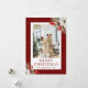 Elegant red botanical photo Christmas card featuring a watercolor painting of poinsettia, conifer tree branches, holly and red berries against a snowy background. Easily personalize this holiday card with your photo and text.