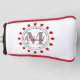 This golf driver cover features your monogram in grey within a circle framed with black dots and double black lines. On the outside of the black frame is a circle of bright red stars. Your name is written in matching red over the grey centre monogram. Classy!