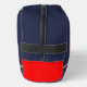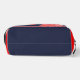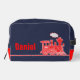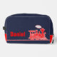 Bright red puffing steam train travel toiletry bag. Personalise with your own name, perfect for overnight railway journeys. Currently reads Daniel and Daniel on boiler plate. Part of the graphic steam train range. Background colour can also be changed to your own colour choice currently in dark blue and bright red. A perfect gift for a train or railway transport fan. Original steam train graphic art and design by Sarah Trett exclusively for www.mylittleeden.com on zazzle.