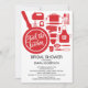 Stylish red & white stock the kitchen wedding shower invitation featuring kitchen tools including a frying pan, hand mixer, kitchen timer, pot, utensils, apron, whisk, measuring cup, pot holder & cups. Visit our shop to view this kitchen shower invite in other colours & matching recipe cards