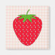 Nice bright red strawberry design, with a green top and a light pink gingham check background.