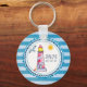 A keychain with a nautical theme. Designed on a blue striped pattern and a circular nautical frame layered over top. A red striped lighthouse and a beach ball, with a smiling sun and seagull flying off in the distance positioned inside the frame. Personalise with your initials and wedding date.