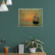 This sunset painting shows a long sailboat on a calm sea at sunset. The sky is filled with red and orange as the sun nears the horizon.