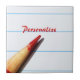 A handwritten style tile with a bright red coloured teacher's correcting pencil laying on a white sheet of lined school paper. Personalise this scholastic design by signing your name. Perfect for writers, teachers, or students in middle school or junior high.