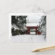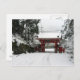 Postcard featuring photography of a red temple gate in falling snow. Taken at Honkokuji Temple in Kyoto, Japan.