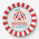 Come one, come all! Complete your decor at the greatest birthday party under the big top with our circus carnival party plates templates. This circus carnival ticket birthday party plates features red and teal tent with a red big top tent background on a party plates design.