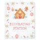 Sweet gingerbread house decorating station birthday party sign featuring some editable text, a cute gingerbread house, various candy, a gingerbread man and cupcake. Sure to set the scene for a Christmas season gingerbread decorating birthday party.