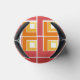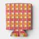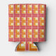 This can cooler has a geometric design of L's in red, orange, and yellow, placed in different directions on a field of white.