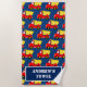 Red toy dump truck design custom kid's beach towel. Cool dumptruck construction vehicle pattern print towel for children. Unique Birthday gift ideas for boys who love cars. Blue or custom background colour. Large size for beach or pool. Create your own extra large towels for son, grandson, friends, nephew etc. Personalise with his or her name.