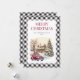 Black and white buffalo plaid Merry Christmas card featuring a winter scene with a retro red truck.