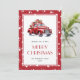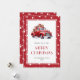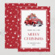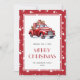 Custom retro red Christmas cards featuring a classic red truck, falling snow and stars. Easily personalise these watercolor red truck Christmas cards with your family name.