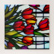 Pictured in a leadlight design are red tulips
