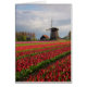 Greeting card with a spring landscape with a field with red tulips and other flowers and a windmill during sunrise in the Keukenhof gardens, Bulb Region, the Netherlands.