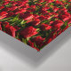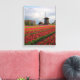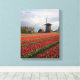 Vertical canvas landscape print of a spring landscape with a field with red tulips and other flowers and a windmill during sunrise in the Keukenhof gardens, Bulb Region, the Netherlands.
