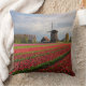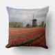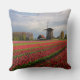 Square photo throw pillow cushion with a spring landscape with a field with red tulips and other flowers and a windmill during sunrise in the Keukenhof gardens, Bulb Region, the Netherlands.
