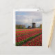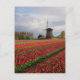 Vertical postcard with a spring landscape with a field with red tulips and other flowers and a windmill during sunrise in the Keukenhof gardens, Bulb Region, the Netherlands.