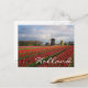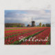 Postcard of a spring landscape with a field with red tulips and other flowers and a windmill during sunrise in the Keukenhof gardens, Bulb Region, the Netherlands with the text 'Holland'.