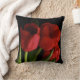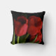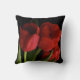 This gorgeous throw pillow features a bouquet of scarlet red tulips and green leaves set on a pure black background. The image is repeated on the back.