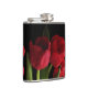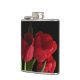 A bouquet of scarlet red tulip flowers and green leaves set on a pure black background grace this gorgeous floral hip flask.