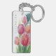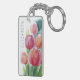 Red tulips watercolor spring blooms keychain features modern loose watercolor sketch of red, orange and pink spring flowers, elegant girly floral design. Replace the sample name with your own to create a personalised gift