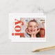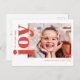 This is a bright and simple red and white holiday postcard featuring a minimalist single photo combined with “joy” in a bold and elegantly classic serif font.