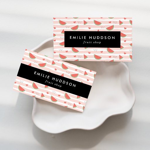 Cute, fun and adorable business cards with watermelons, hearts and stripes. Modern and trendy design, perfect for fruit shops, fruit sellers and farmers markets.