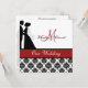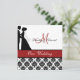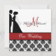 Black and white damask print with a red band, a silhouette bride and groom, and areas you can personalise with your names, monogram initial, wedding ceremony and reception information on a customised wedding invitation that's classy and traditional all in one!