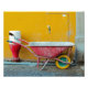 Red wheelbarrow with the vibrant yellow wall resting on a cobblestone road.