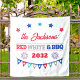 Celebrate the Fourth of July in style with this patriotic "RED, WHITE & BBQ" backdrop. Decorated with little stars, patriotic fireworks, and a festive banner, this tapestry is fully customisable with your family name and the current year to celebrate America's birthday in style.