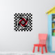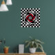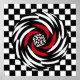 An eye-catching abstract, a swirl of black and white with bright red accents on a checked background.
