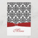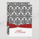 This black and white damask wedding Menu Card has a red PRINTED ON ribbon and diamond jewels brooch on it that matches the wedding invitation and other items shown below. If you require any other matching items, please email me your request to niteowlstudio@gmail.com.