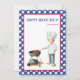 Simple but cute red, white and blue cookout happy 4th of July greeting card with an illustration of a person doing a barbecue. Very patriotic background with white stars over a blue background and red and white lines at the back of the card, to represent the American flag.