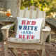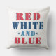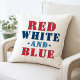 Stylish Fourth of July holiday pillow design features a "Red White and Blue" typography design in red, white, blue, navy colours with star accents. A coordinating navy blue with white star pattern appear on the back.